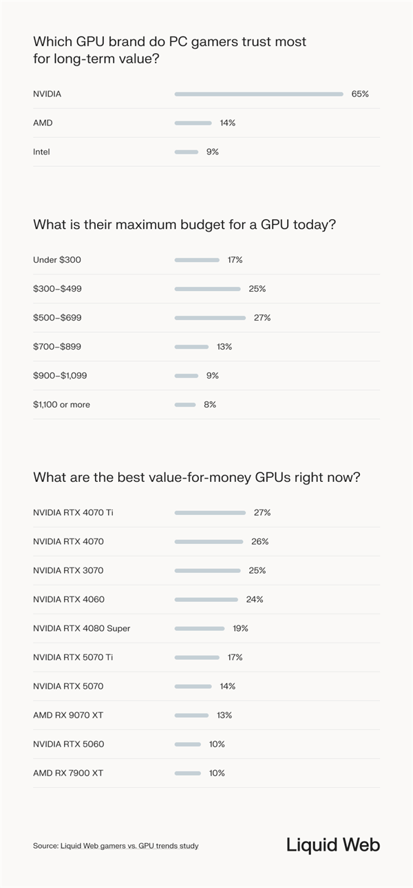 当被问及认为哪款显卡性价比最高时,27%的玩家投票给了RTX 4070 Ti,一些人还对基于Ampere架构的RTX 3070感到满意,至于AMD最新的RX 9070 XT,只有13%的玩家选择。