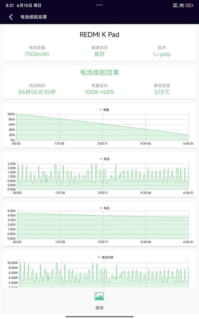 经过电池狗狗实测,REDMI K Pad连续运行了6小时06分钟后,电量从一开始的100%降到20%,据此计算平板的综合电池续航超过了7.5个小时。