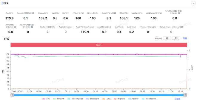 《王者荣耀》低负载手游,在极致画质下可开启120帧率,在特效拉满条件下进行一局5V5的团战测试,游戏平均帧率稳定在119.9FPS,游戏的平均波动仅有0.1。