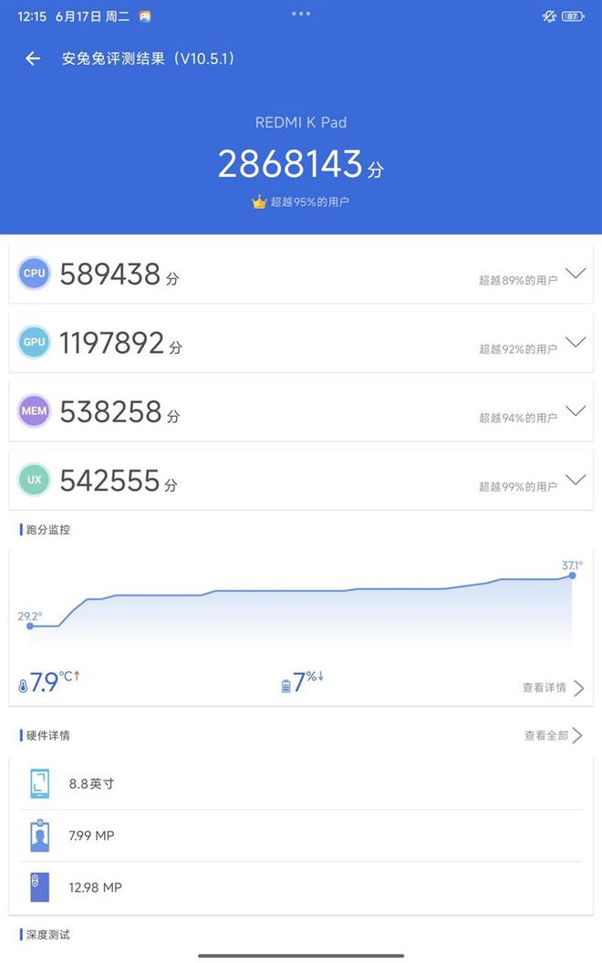 安兔兔V10综合成绩286.8万分,其中CPU分数为58.94万分,GPU分数为119.79万分,放在安卓平板领域也是数一数二的水平。