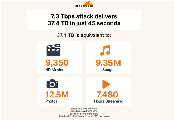 在这次攻击中,攻击者向一个目标IP地址发送了37.4TB的数据,相当于10000部高清电影,而这一切仅在45秒内完成。