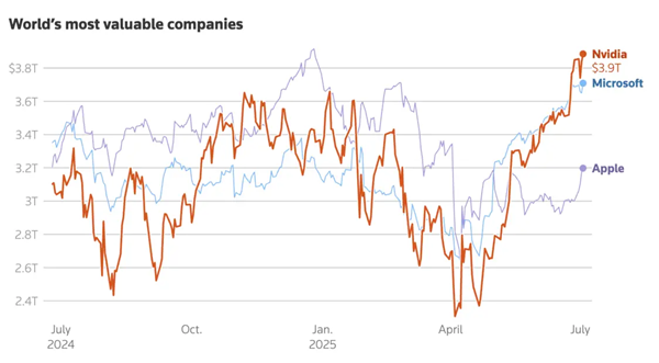 7月4日消息,在周四的盘中交易中,NVIDIA的市值一度突破3.92万亿美元,短暂超过了苹果在2024年年底创下的3.915万亿美元的全球最高市值记录。
