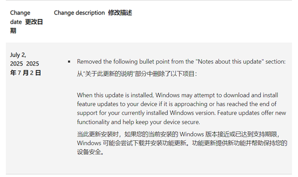 微软在其支持文章中新增了一个变更日志部分,以补充这一新信息,发布说明中删除了之前提到的强制升级的相关内容。
