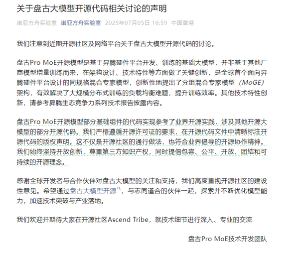 针对网上有声音质疑华为盘古大模型存在抄袭行为,华为盘古团队发布《关于盘古大模型开源代码相关讨论的声明》进行回应。