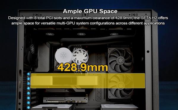 对于需要高性能显卡的用户,Seta H2也提供了足够的空间,机箱支持最长428.9毫米的显卡,但如果安装侧面散热器和风扇,显卡长度可能会受到限制,最大支持330毫米。