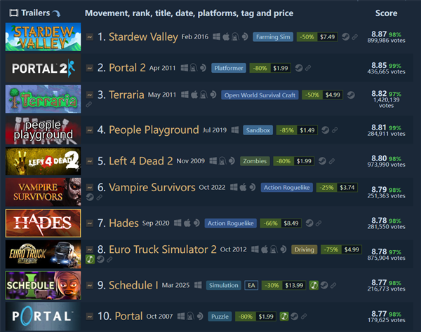 《传送门2》以99%的正面评价位居第二,主要是由于其评价总数为436665,低于《星露谷物语》,而《泰拉瑞亚》则以97%的正面反馈和142万条评论位列第三。