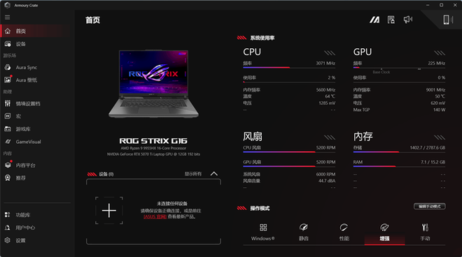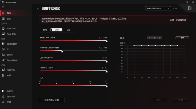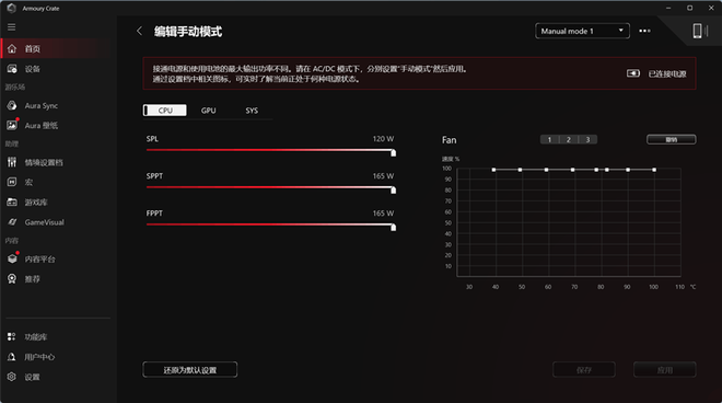 在华硕的奥创智控中心Armoury Crate软件中,将ROG魔霸9笔记本的性能模式设置为手动,可以释放出比增强模式下更加极限的性能。