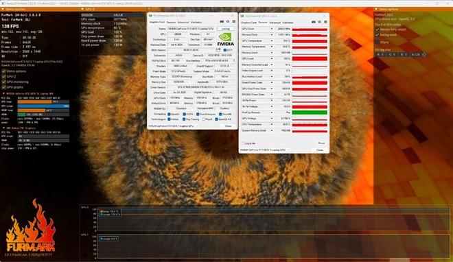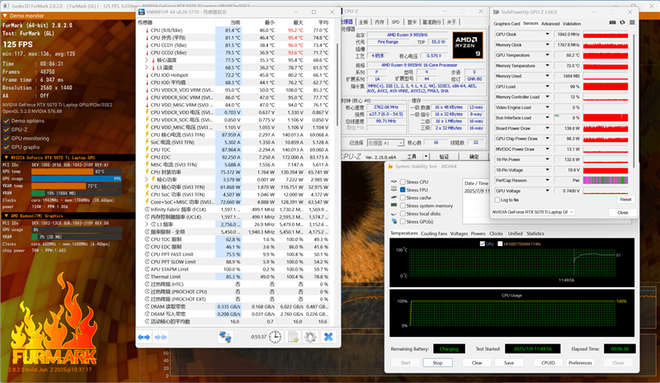 单烤十分钟,ROG魔霸9笔记本搭载的NVIDIA RTX 5070 Ti 笔记本电脑GPU可以稳定释放140W功率,核心频率超过2GHz,温度约80度。