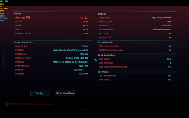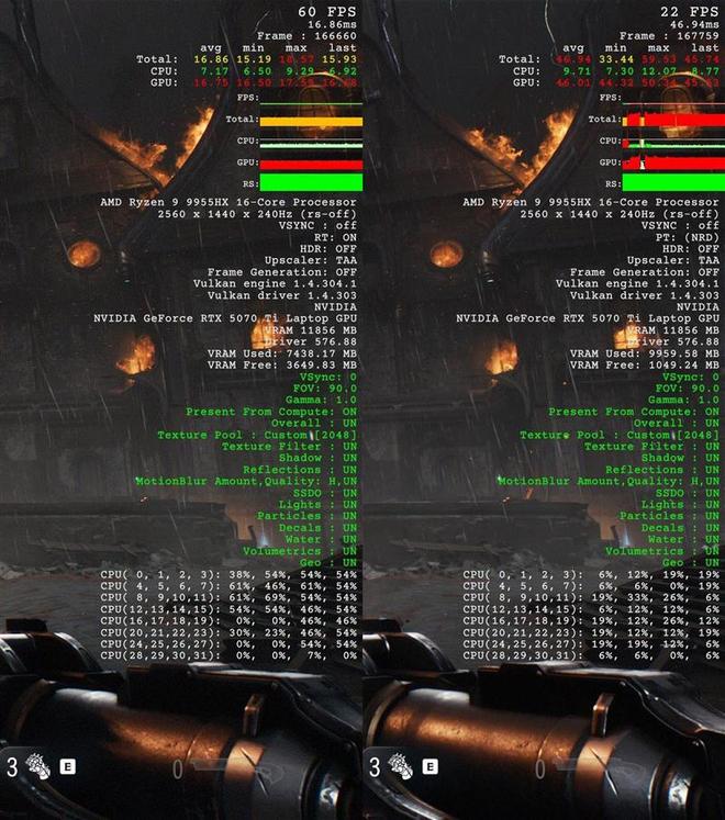 最新的路径追踪功能对GPU性能要求极高,我们在2K分辨率下使用超级噩梦预设,在TAA抗锯齿模式下,启用路径追踪后帧率从60帧直接降到22帧,暴降63.3%。