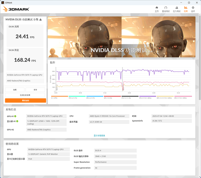 三、GPU理论性能测试:DLSS 4测试帧数提高近700%!