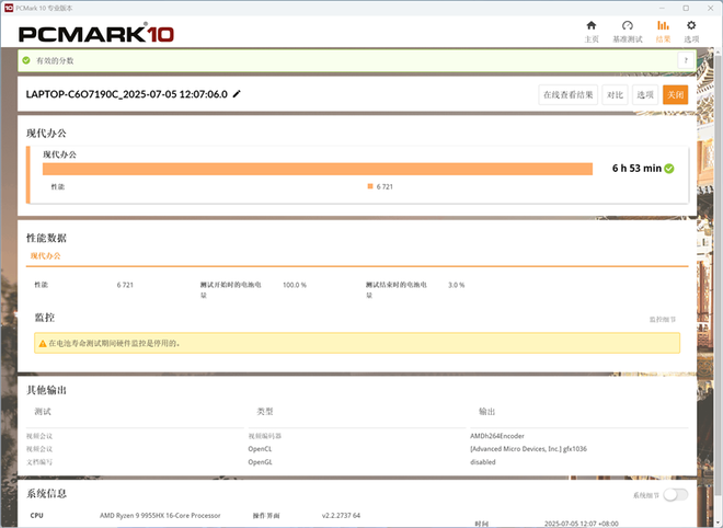 我们使用PCMark 10的现代办公模式进行续航测试,将电池充满至100%,亮度调整为50%,测试结束时电量为3%。ROG魔霸9笔记本最终测试成绩为6小时53分钟。