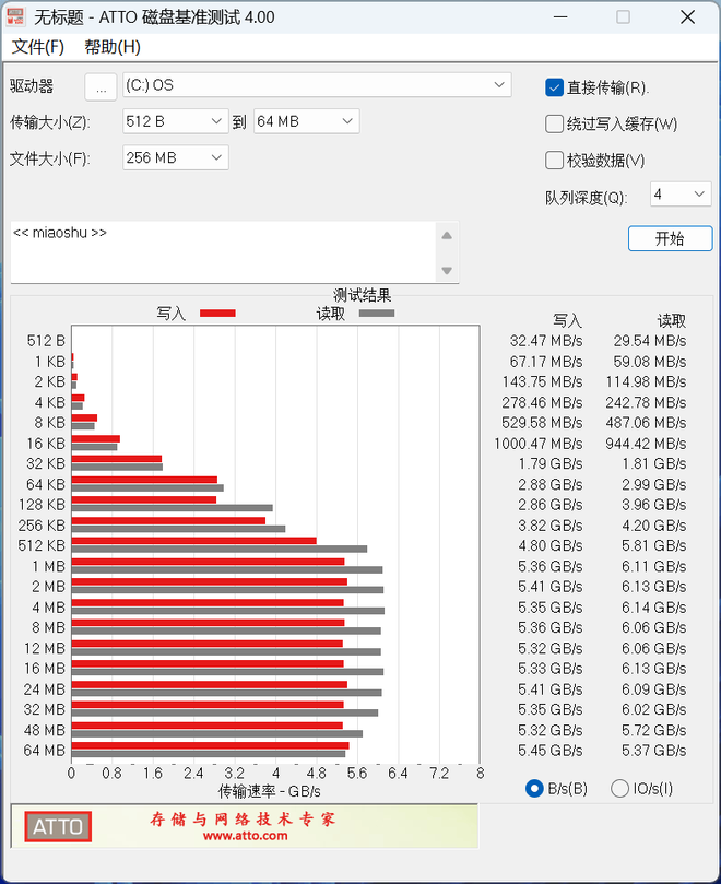 ATTO Disk Benchmarks测试结果,对于0.5KB的小文件读写,能达到接近30MB/s的读取速度和超过32MB/s的写入速度,16K的时候,读写速度可接近1GB/s,从512KB开始,读写速度就达到了接近5GB/s的最大值。