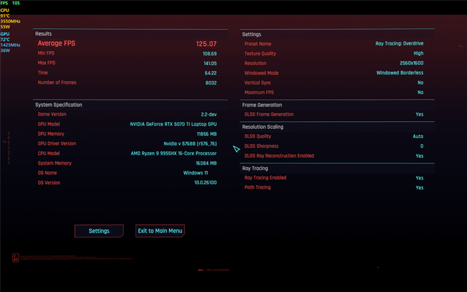 在《赛博朋克:2077》中,使用光线追踪:超速预设,在开启DLSS 4最高的4X级别多帧生成时,在2K分辨率下的测试帧率为 125.07,帧数提升309.4%。