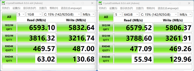 在CrystalDiskMark测试中,实测持续读写速度分别为6593MB/s和5832MB/s,4K随机读写速度为63 MB/s和130 MB/s。