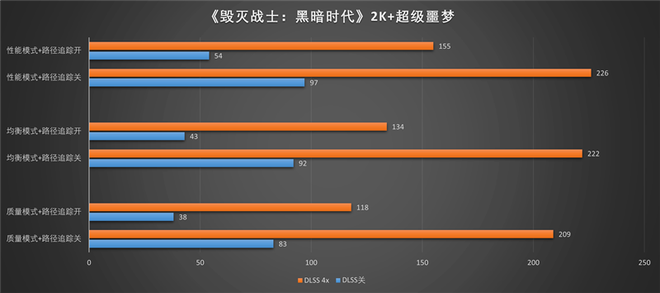 我们在2K分辨率下使用超级噩梦画质预设,对DLSS性能、DLSS均衡和DLSS质量三个档位进行了测试,分别记录下是否启用路径追踪和是否启用DLSS 4多帧生成时的游戏帧数。