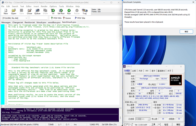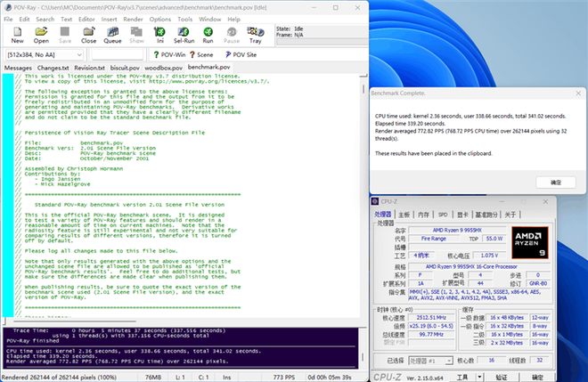 在POV-Ray测试中,单核成绩为772.82PPS,多核成绩为12447.48PPS。