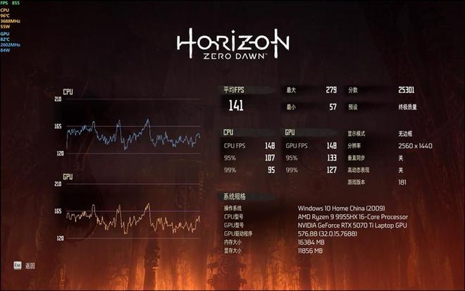 在《地平线:零之曙光》中,使用终极质量画质进行测试,2K分辨率下平均帧率为141。