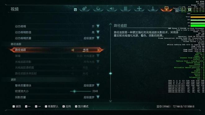 在《毁灭战士:黑暗时代》的画面设置中,没有提供光追功能的开关,默认是启用光追功能,但最新的路径追踪功能提供了单独的开关和详细设定选单。