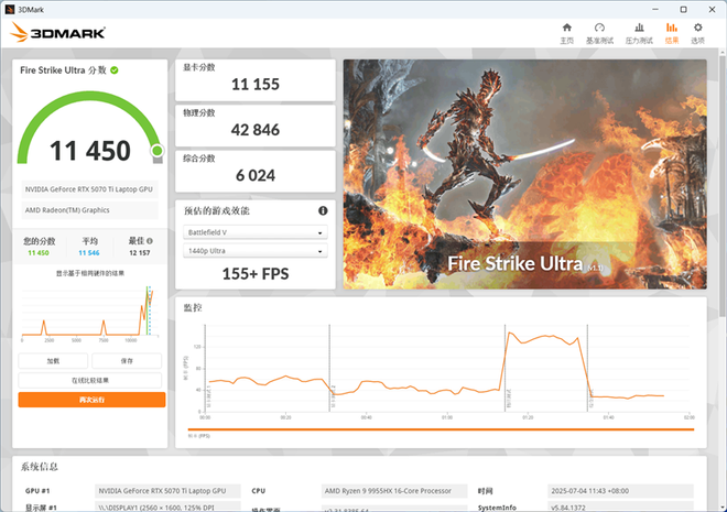 在3DMark的Fire Strike Ultra(DX11+4K渲染分辨率)测试中,总成绩为11450,其中GPU分数为11155。