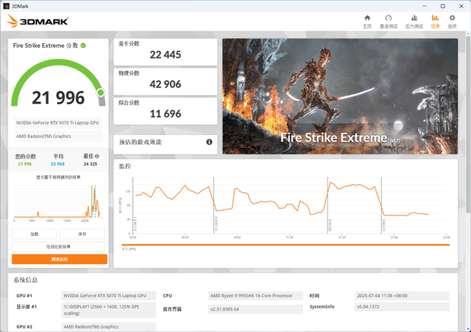 在3DMark的Fire Strike Extreme(DX11+2K渲染分辨率)测试中,总成绩为21996,其中GPU分数为22445。