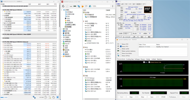 在手动模式下,单烤CPU十分钟,ROG魔霸9笔记本搭载的AMD锐龙9 9955HX处理器可以稳定释放128W的性能,温度约92度。