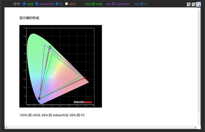 ROG魔霸9笔记本屏幕实测色域可覆盖100%的sRGB色彩空间和98%的DCI-P3色彩空间。