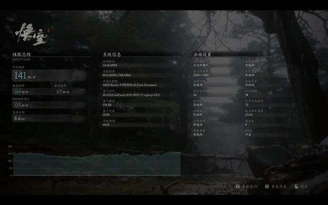《黑神话·悟空》使用影视级画质预设,DLSS采样精度设置为50,在开启DLSS 4最高的4X级别多帧生成时,在2K分辨率下的测试帧率为141,帧数提升293.75%。
