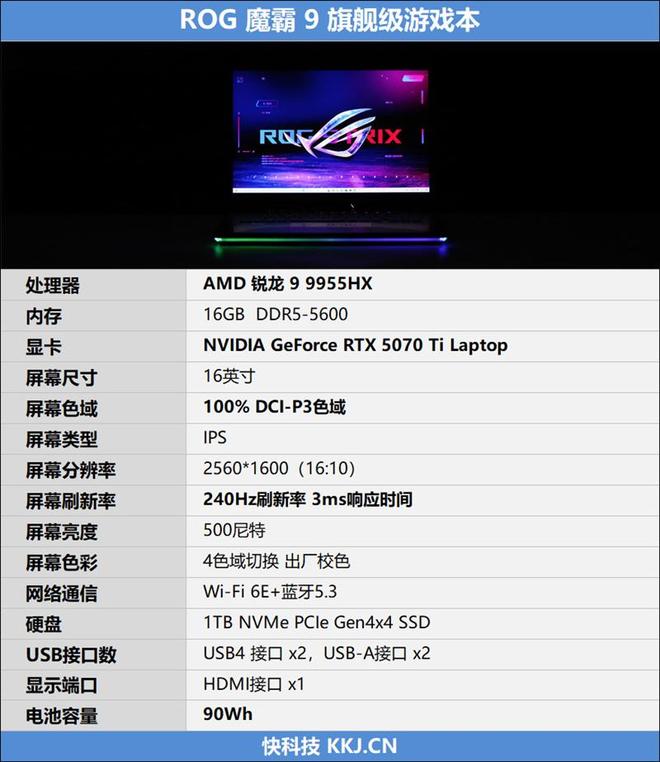 我们拿到的这台ROG魔霸9笔记本搭载了AMD锐龙9 9955HX处理器,还有更高配置可选AMD锐龙9 9955HX3D处理器, 搭载了NVIDIA RTX 5070 Ti 笔记本电脑GPU ,支持最新的DLSS 4多帧生成技术。