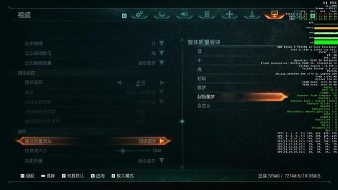在《毁灭战士:黑暗时代》的画面设置中,我们将特性指标和整体质量都设置为超级噩梦。