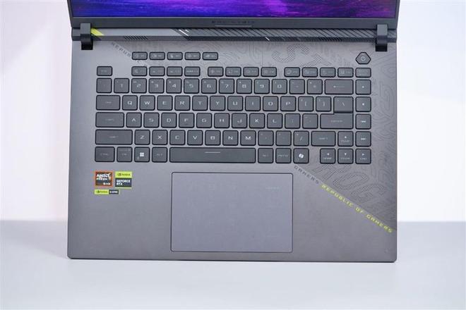 ROG魔霸9笔记本C面的影刃键盘,长键程全尺寸键盘支持单键RGB灯效,全高方向键设计,右上角同样设计了斜切的涂鸦式暗纹。