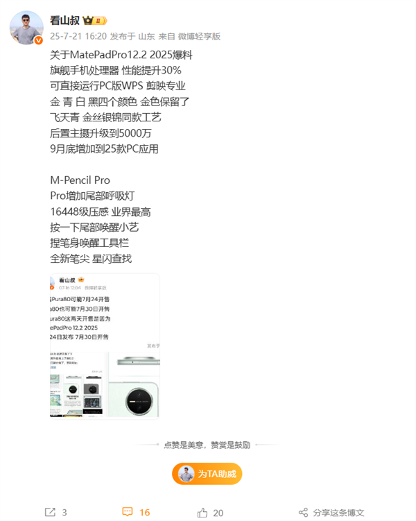 据博主"看山叔"爆料,该平板可直接运行PC版WPS、剪映专业版,9月底将增加到25款PC应用。