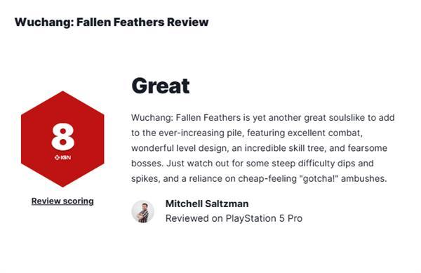 IGN为本作给出8分的好评,简评称,《明末:渊虚之羽》为日益壮大的类魂游戏阵营再添佳作,具有出色的战斗系统、精妙的关卡设计、令人惊叹的技能树以及强悍的Boss。