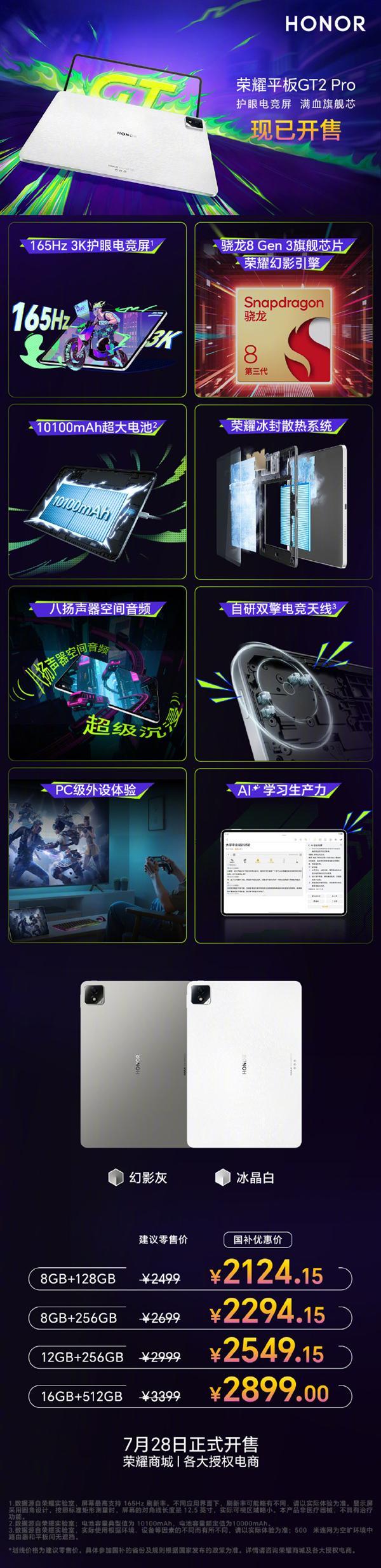 7月28日消息,今日,荣耀平板GT2 Pro正式开售,售价为2499元起,国补优惠价低至2124.15元。