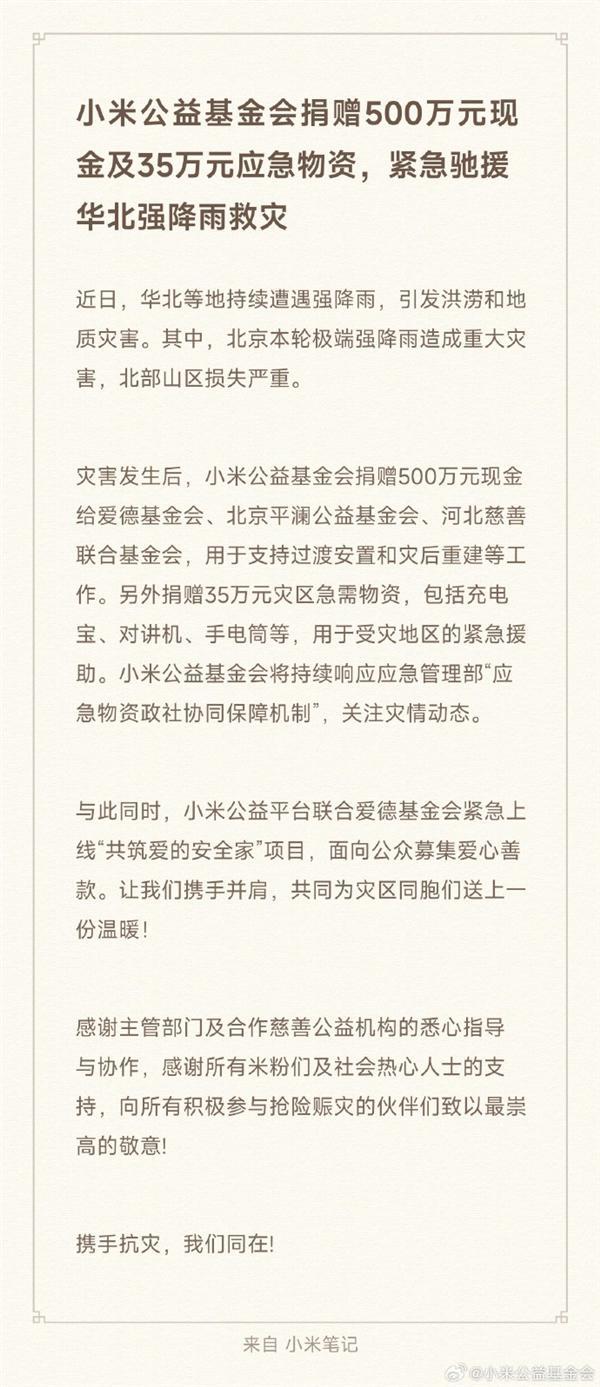 7月29日消息,今日,小米公益基金会官微发文,称小米公益基金会捐赠500万元现金及35万元应急物资,紧急驰援华北强降雨救灾。