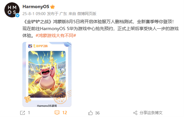 值得一提的是,《金铲铲之战》鸿蒙版今天也同时官宣,8月5日将开启体验服万人删档测试。