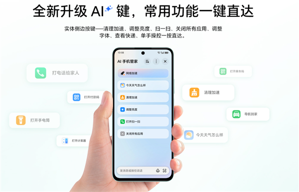 据了解,荣耀畅玩70 Plus配备全新实体侧边AI键,一键清理加速、调整亮度、扫一扫、关闭所有应用、调整字体、查看快递等。