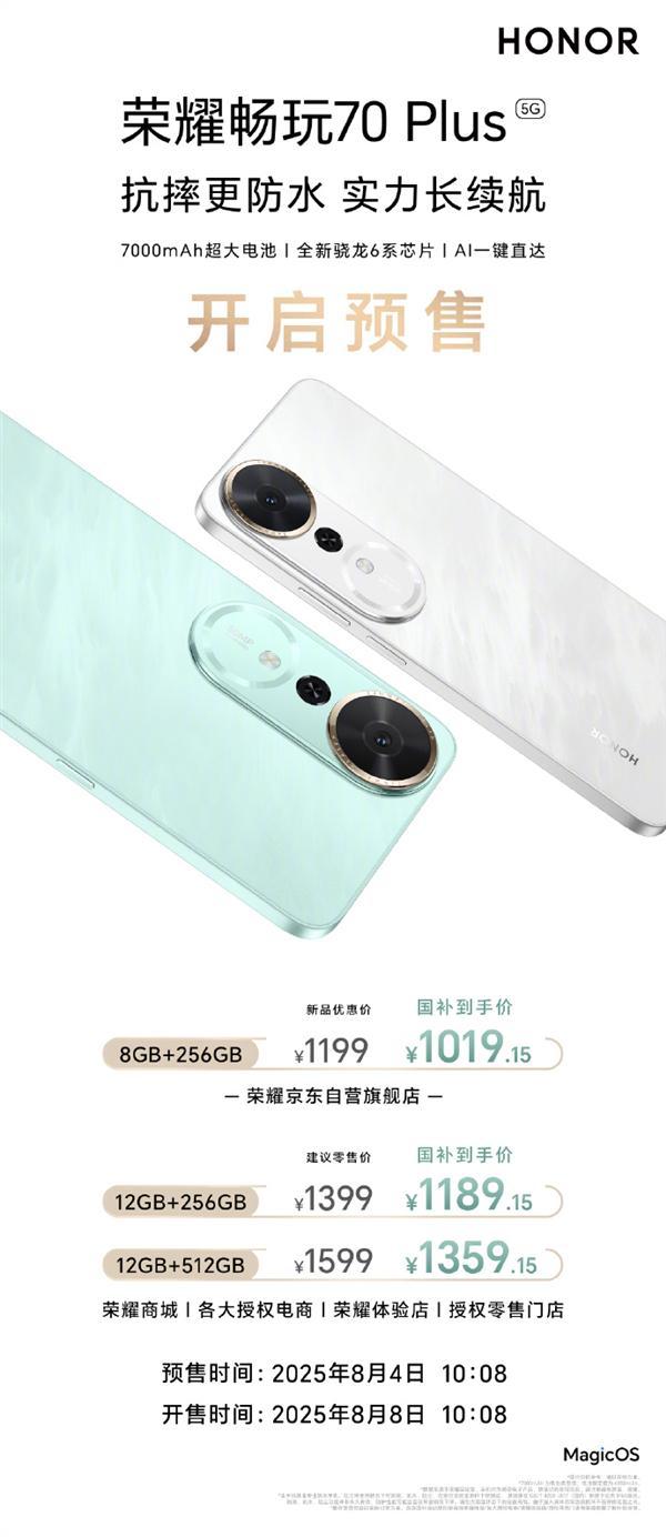8月4日消息,今日,荣耀畅玩70 Plus正式发布,国补到手价1019.15元起。