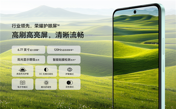荣耀畅玩70 Plus正面采用6.77英寸LCD屏,1610*720分辨率,支持120Hz刷新率、DC无频闪调光、护眼模式、类自然光护眼。