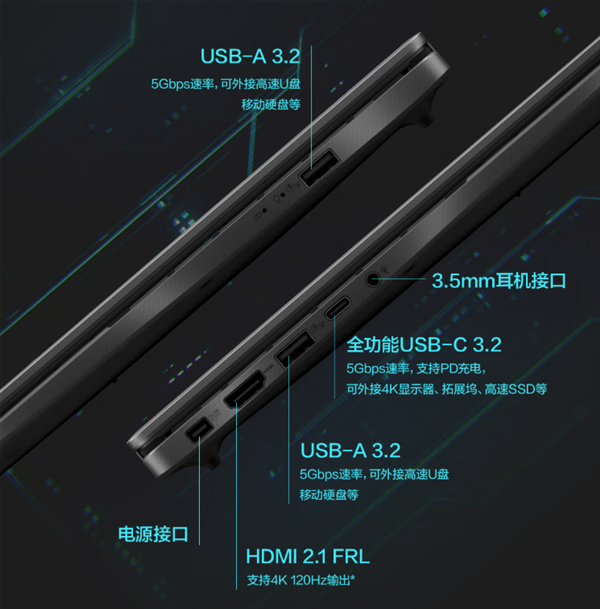 接口配置丰富实用,包含全功能USB-C 3.2(支持PD充电和视频输出)、HDMI 2.1 FRL、USB-A 3.2、3.5mm音频接口等,无需转接器即可满足多设备连接需求。