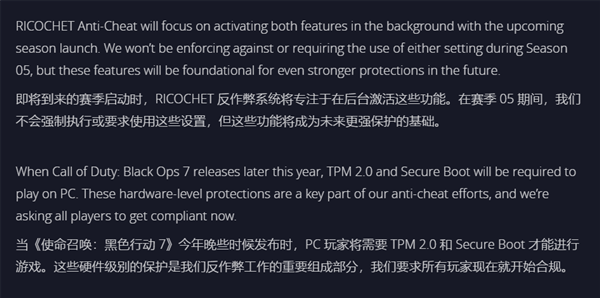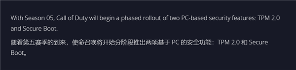 根据介绍,在《使命召唤:黑色行动6》第五赛季之后将开启TPM2.0与安全启动功能,未启用的玩家将会在启动游戏时会收到通知。