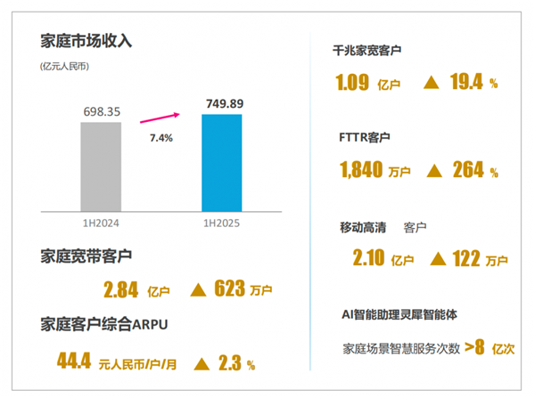 家庭市场收入750亿元,同比增长7.4%,千兆宽带客户达1.09亿户,FTTR(光纤到房间)客户同比增长264%。家庭客户综合ARPU达到人民币44.4元,同比增长2.3%。