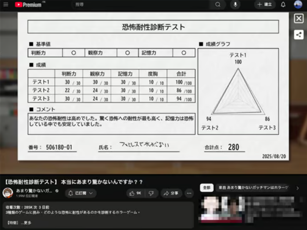 比如日本知名游戏直播主ガッチマン,以玩恐怖游戏不恐怖、高速通关而闻名,他在这款游戏中获得了280/300分的高分。