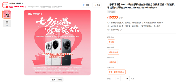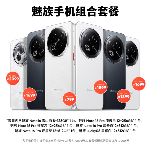 套餐内含魅族Note16雪山白8+128GB*1台、魅族Note16 Pro流云白12+256GB*1台、魅族Note 16 Pro逐星灰12+256GB*1台、魅族Note 16 Pro流云白12+512GB*1台、魅族Note 16 Pro逐星灰12+512GB*1台、魅族Lucky 08星耀白12+512GB*1台。