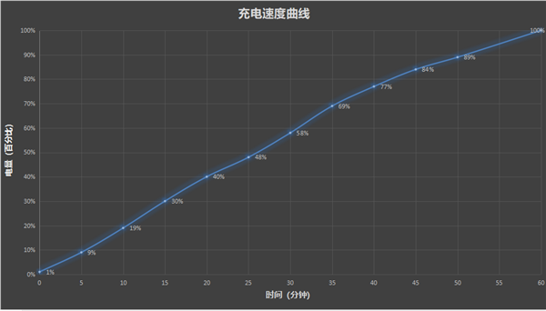 实际测试表现如下图所示,10分钟可充至19%, 20分钟可充至40%, 半小时可充至58%, 最终60分钟可充满100%电量。
