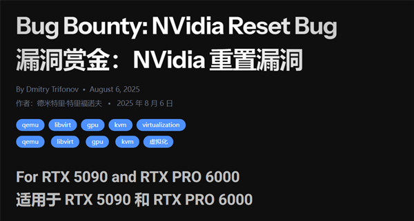 9月7日消息,据报道,NVIDIA的RTX 5090和RTX PRO 6000显卡最近被发现存在一个可复现的虚拟化重置漏洞,该漏洞会导致显卡完全无响应,直到主机系统物理重启才能恢复。