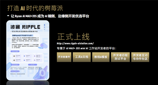 一方面是丰富的开发工具,包括自家的AMD ROCm开源软件框架, Ryzen AI software等开发工具(充分调动CPU/GPU/NPU三大引擎),以及各种第三方资源(一站式开发聚合平台RIPPLE AI已上线),力图将其打造成AI时代的树莓派。