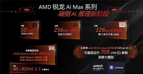 锐龙 AI Max系列可以搭配最多128GB LPDDR5X-8000统一内存,带宽高达256GB/s,分配最多96GB作为专属显存,从而能在本地直接运行例如GPT-OSS-120B这种千亿参数的完整大模型,尤其是对于MoE专家模型可谓得天独厚。