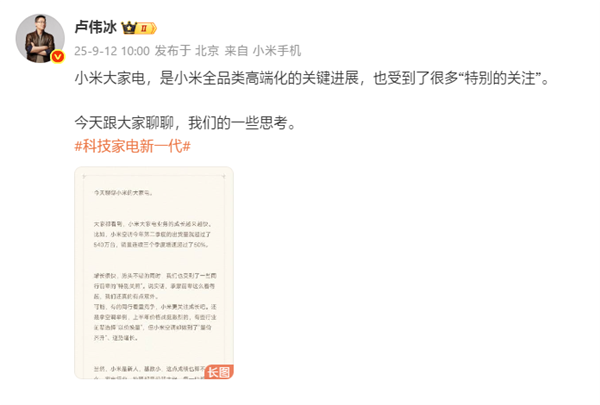 9月12日消息,卢伟冰今天发文表示:小米大家电,是小米全品类高端化的关键进展,也受到了很多"特别的关注"。