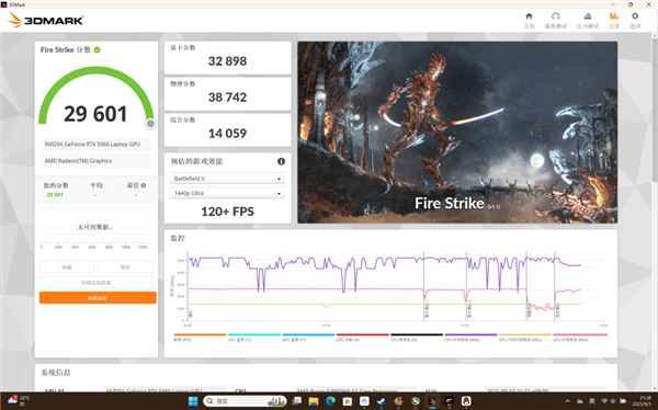 代表DX11性能的Fire Strike,总成绩为29601分,显卡分数为32898。
