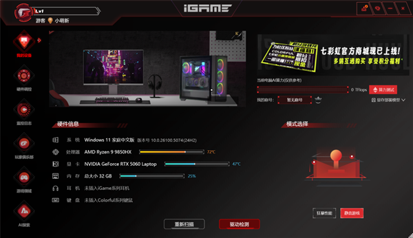 七彩虹橘宝R16 Ultra自带的性能控制软件叫做 "自在星球",用户能在其中监控设备温度,可选择狂暴性能和静音游戏两种模式